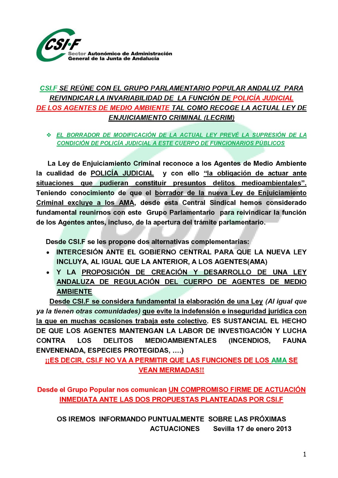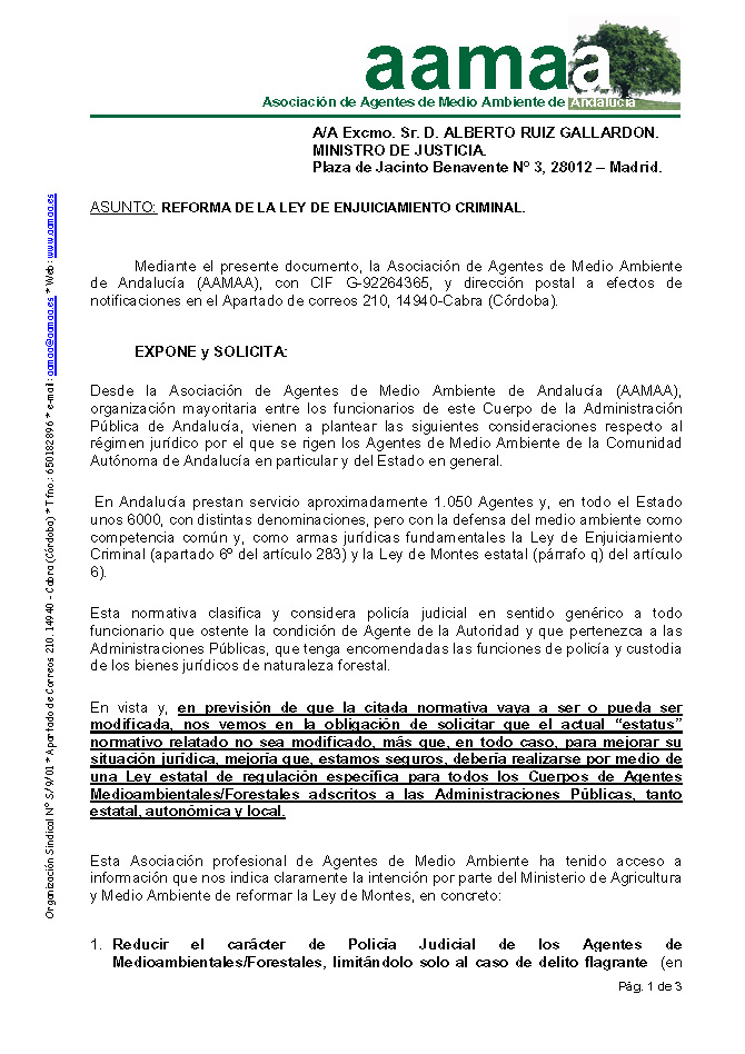 El CSIF solicita que los cambios en la Ley de Enjuiciamiento Criminal no afecten a la investigación de delitos realizada por los Agentes de Medio Ambiente