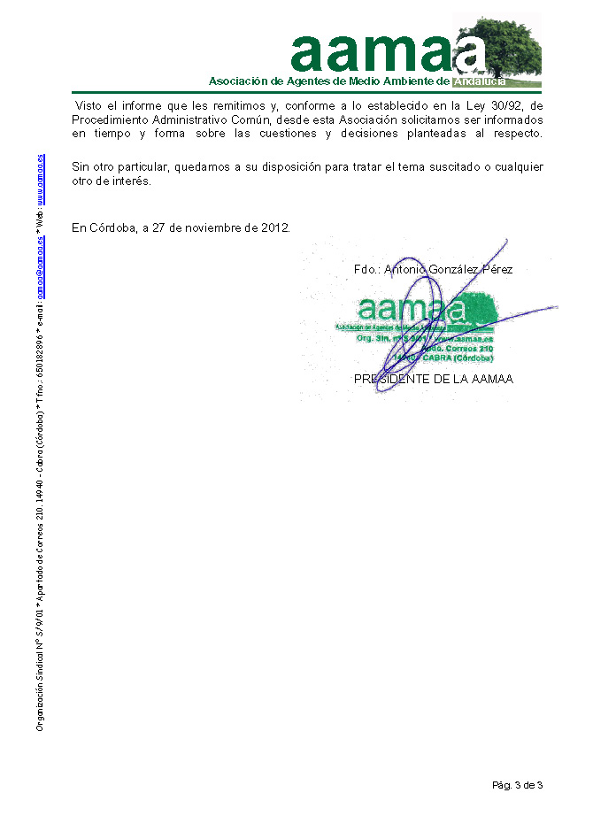 Andalucía (AAMAA), remitió el pasado mes de noviembre petición escrita al