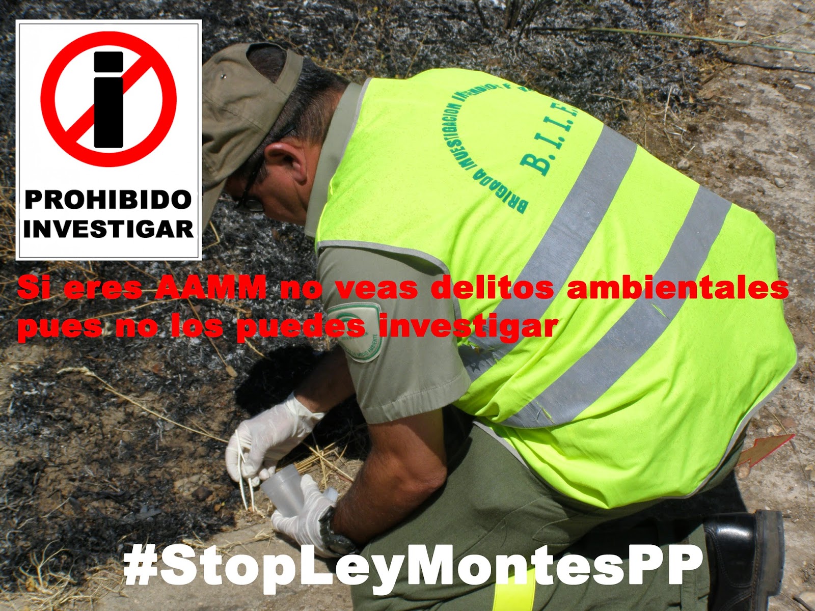 Los Agentes de Medio Ambiente andaluces especializados en la investigación de delitos ambientales de las Brigadas de Investigación de causas de incendios Forestales (BIIF), de las Brigadas de Investigación de Envenenamiento de Fauna (BIEF) y de la Unidad Forense de apoyo (UFOA) vienen trabajando en régimen de colaboración con efectivos de las Fuerzas y Cuerpos de Seguridad del Estado. Este trabajo coordinado ha hecho que se incrementen las condenas judiciales a incendiarios y envenenadores, por lo que no se entiende la ruptura de una colaboración que viene siendo exitosa, pasando los Agentes de Medio Ambiente con la nueva Ley de Montes a ser meros auxiliares en la averiguación de delitos. La única explicación es que se vaya buscando un modelo de investigación «teledirigida» sin funcionarios de carrera civiles que no funcionan ni van a funcionar por el esquema militar del taconazo y firmes.