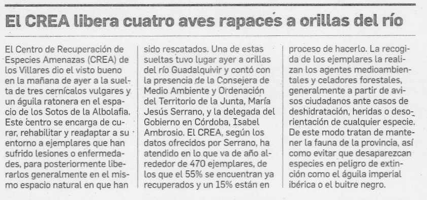 Una de estas sueltas tuvo lugar ayer a orillas del río Guadalquivir y contó con la presencia de la Consejera de Medio Ambiente y Ordenación del Territorio de la Junta, María Jesús Serrano y la delegada del Gobierno en Córdoba, Isabel Ambrosio. El CREA, según los datos ofrecidos por Serrano, ha atendido en lo que va de año alrededor de 470 ejemplares, de los que el 55% se encuentran ya recuperados y un 15% están en proceso de hacerlo.
